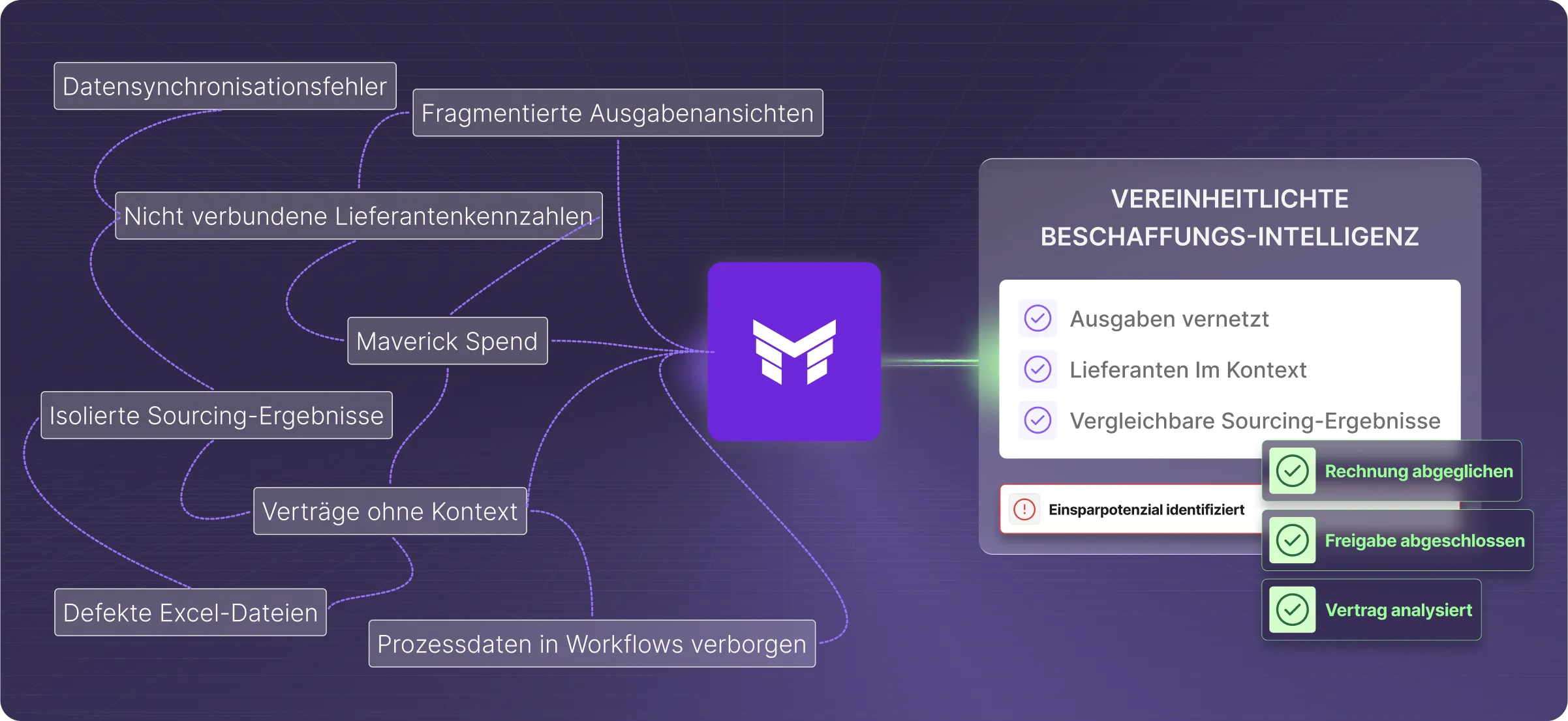 Statt sich durch Reports zu arbeiten, bekommen Teams klare Erklärungen und Handlungsempfehlungen auf Basis aktueller Einkaufsdaten, vollständig eingebettet in Ihre Prozesse und Richtlinien.