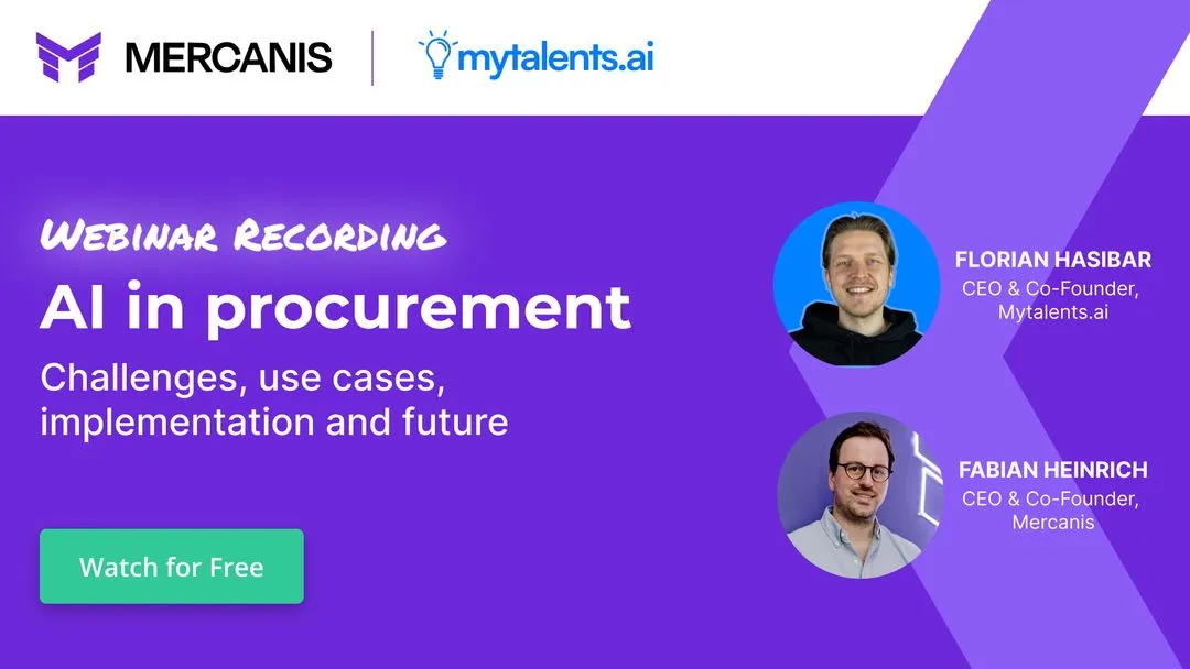 In this webinar, Florian Hasibar, CEO & Co-Founder of mytalents.ai, and Fabian Heinrich, CEO & Co-Founder of Mercanis, give a comprehensive overview of the use of artificial intelligence in procurement. Together, they will discuss current trends, challenges and the most useful use cases.